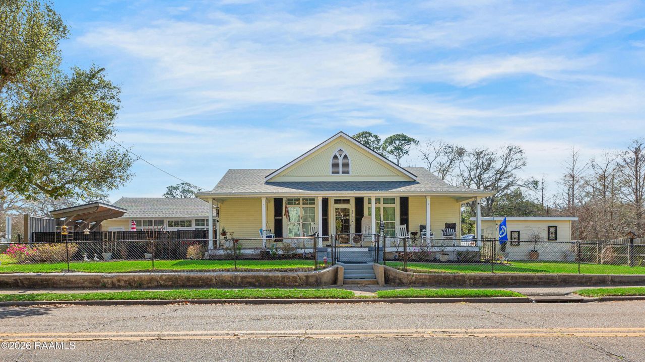 Stunning historic residence with sweeping views of Bayou Teche and downtown New Iberia. This beautifully maintained home blends timeless architectural charm with thoughtful updates, all in a prime location. A spacious front porch welcomes you and offers the perfect setting to enjoy the bayou views. Inside, the front door opens to an expansive living room featuring a fireplace with electric insert. The adjoining dining room creates an elegant space for entertaining. Both rooms are highlighted by vintage crystal chandeliers that enhance the homes historic character. A wide central hallway anchors the interior. On one side are three generously sized bedrooms, each with a private ensuite bath. Large walk-in closet in the primary bedroom. A convenient half bath is also located along this wing for guests. On the opposite end of the hall, the updated kitchen offers abundant cabinetry, a gas cooktop, and electric ovens, providing both function and style. The former garage has been thoughtfully converted into a spacious family room with an additional half bath, creating a versatile living area ideal for gatherings.Step outside to a private New Orleans-style courtyard featuring slate flooring, a brick and iron fountain, and an outdoor kitchen -- a true entertainers retreat.Additional amenities include gated rear parking behind a wood fence, a storage building, a roof less than five years old, and an HVAC system approximately 2 years old. A rare opportunity to own a historic property with modern conveniences in the heart of New Iberia.
