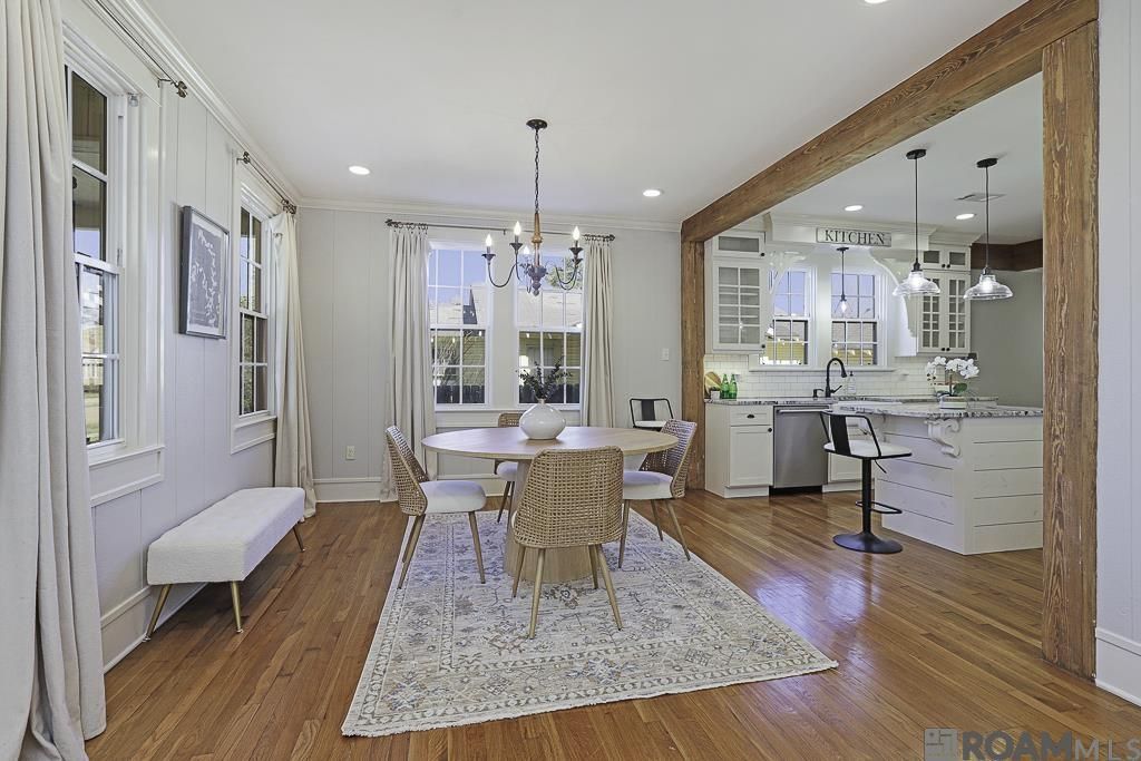 Charming 3-bedroom main home + a bonus room, + a detached 571 sq/ft apartment (full kitchen, bath, living room & laundry) and a separate 571 sq ft workshop/garage, all tucked behind a white picket fence in the Garden District! This precious cottage blends original character with thoughtful modern updates & has been completely renovated with a new roof, new windows & cosmetic updates. Original shiplap, antique glass doorknobs, and historic details are woven throughout. The kitchen features antique beams from an 1800s Kentucky home, reclaimed flooring from Hundred Oaks, custom cabinets to the ceiling, stone countertops, farmhouse sink, gas range, subway tile backsplash, island, & a shiplap-wrapped hood vent. The spacious laundry room offers black-and-white hexagon tile. Both bathrooms have been fully renovated. The guest bath includes mini hex tile, an antique vanity, and a subway-tiled shower to the ceiling. The primary suite features an extended sitting area, walk-in closet, wainscoting, clawfoot tub, large tiled shower, and double vanity. Living & dining areas are filled with natural light from a wall of windows. Enjoy the charming front porch with swing and brick pathway. The backyard is fully fenced and includes a 400 sq/ft covered patio with built-in seating, stained beadboard ceiling, and outdoor fireplace, + an elevated deck with awning, brick paver patio with pergola, and no history of flooding. The apartment features wood floors, built-ins, stainless steel appliances, charming 1940s details, excellent storage, and walk-in closets. Previously rented and used by LSU students.