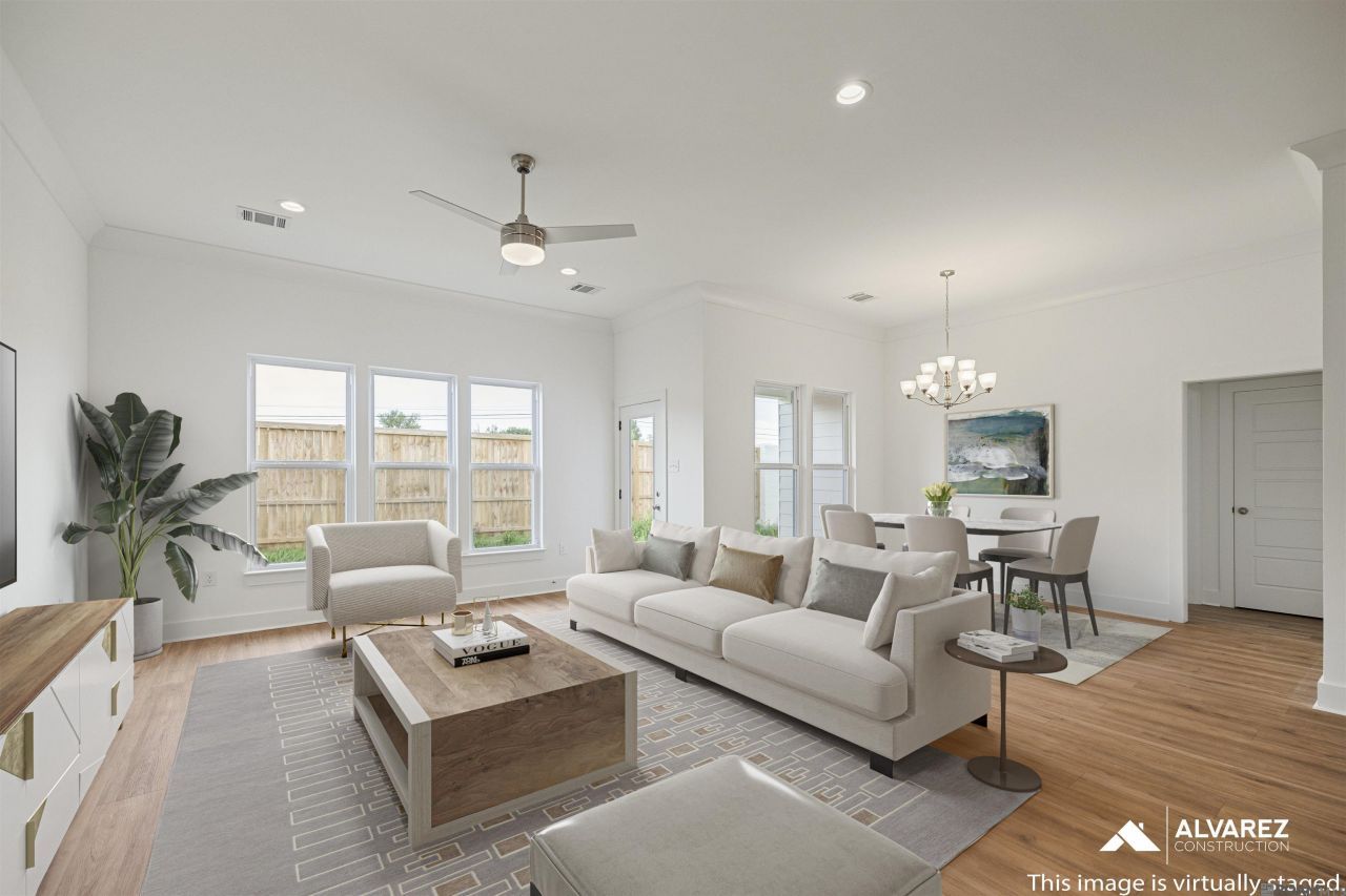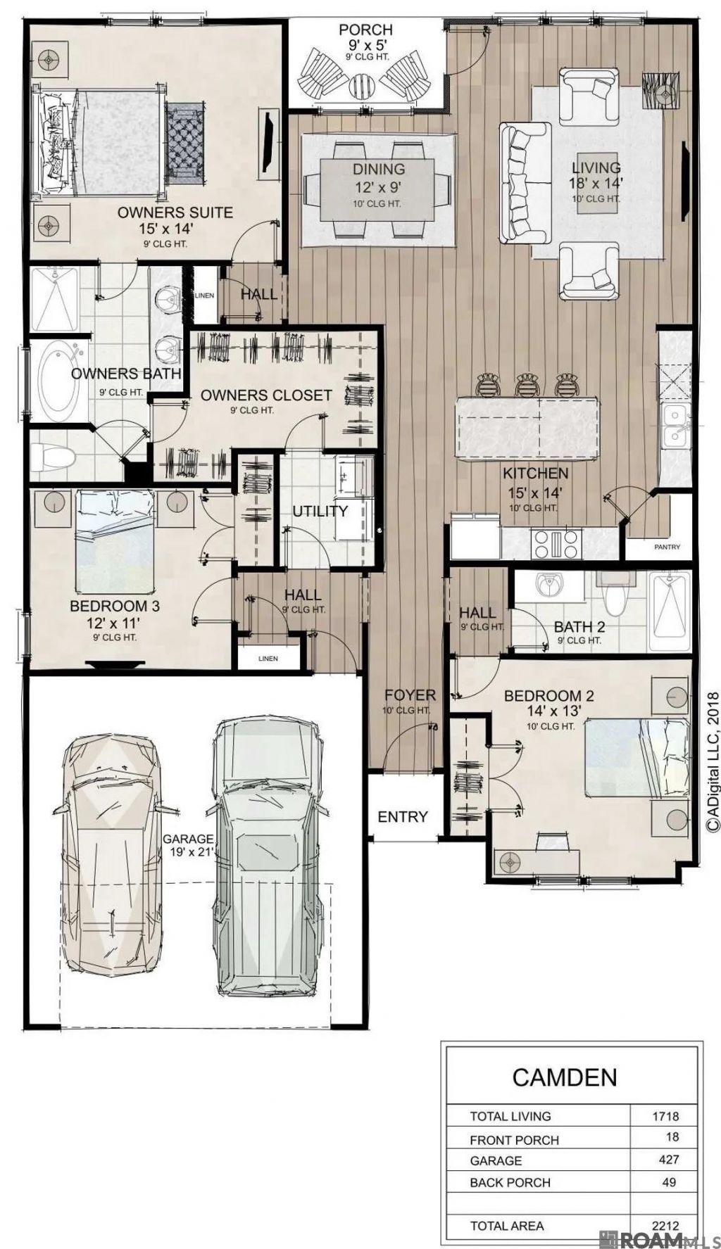 The Camden is a single-story, 3-bedroom, 2-bath home offering 1,718 sq ft with an open layout and 10' ceilings. The kitchen features a large island, gas cooktop, and walk-in pantry. The private owner's suite includes dual vanities, a walk-in shower, garden tub, and spacious closet. Bedrooms 2 and 3 share a front bath. Includes a utility room, 2-car garage, and WiFi-enabled SmartHome features for added convenience. Upgrade Carpet to Vinyl LV2: (Primary BR+Closet/BR2/BR3) LV3 Tiled Shower LV2 Gourmet Kitchen w/ Vent Hood LV2 Granite Countertop Trash Can Pull Out Single Basin Sink LV2 Cabinet Hardware (Satin Nickel, Rounded) Cabinets to the Ceiling LV2 Tiled Shower in Primary BR Upgrade Mirrors: 27530 Sweater Box