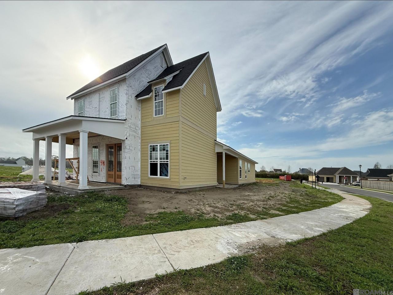 The Martin floor plan by Level homes underway on a corner lot in Water's Edge, the gated section of Lexington Estates. This two-story home has three bedrooms, two and half baths, an office and a small loft! Enter the home from the very inviting front porch into the large open living room which is centered around a gas fireplace with a natural brick surround and raised hearth and a stained beam mantle. The office will be off set to look over the front porch across from the living room. A stained beam separates the living from the dining and kitchen. The gourmet kitchen features custom painted cabinets with extended uppers and under cabinet lighting, large center island with a granite composite sink and two over hanging pendant lights, 3cm Carrara Luxe quartz countertops, 6x12 glossy Blanco tiled backsplash, stainless appliance package with 36 gas cooktop, double wall oven and built in microwave, convenient pot filler, brushed gold plumbing and hardware and a spacious walk-in corner pantry. The primary suite is located downstairs at the back of the home with complete privacy! The primary bath will have dual vanities with quartz countertops and custom framed mirrors, large rectangular tub and separate job-built tiled shower with bench and a seamless glass enclosure and spacious walk-in closet. Upstairs will feature two bedrooms with an open loft area and a hall bathroom with dual sinks. Large walk-in laundry room with linen closet and a mud room with an 'optional mud bench area off the garage entry. Spacious covered side porch will be plumbed for future gas grill. The yard will be professionally landscaped and fully sodded. Estimated completion date of June 2026, buyers can pick/approve certain colors and options for a limited period of time. Other lots/plans available. *The completed pictures are not of actual home but are of the same floorplan; colors and options may vary.