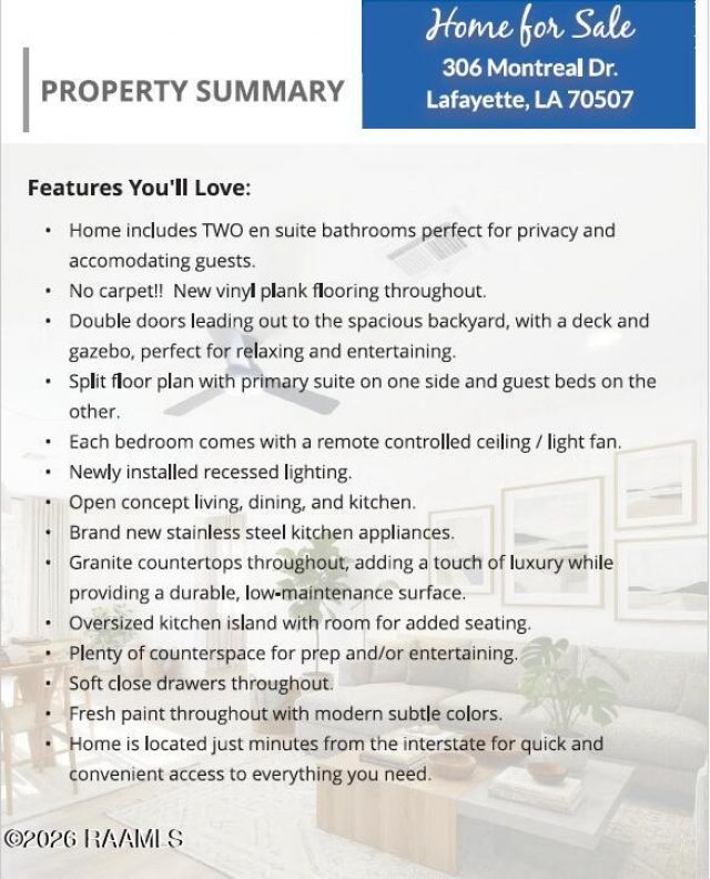 Welcome to this beautifully renovated home, where every detail has been thoughtfully updated from top to bottom--like a fresh canvas ready for your personal touch. Inside, youll find a bright, modern space with new paint throughout and stylish new fixtures that add a touch of elegance. The kitchen is a chefs dream, featuring brand new cabinetry, granite countertops, sleek stainless steel appliances, and a spacious island perfect for gatherings or casual dining. The open floor plan seamlessly connects the kitchen, dining, and living areas, creating a warm, inviting atmosphere. With four bedrooms and three full bathrooms, this home offers plenty of space for family and guests. Two of the bedrooms boast en suite bathrooms, providing comfort and privacy for everyone. Luxury vinyl plank flooring flows throughout the home, combining durability with a contemporary look. Double doors from the dining area open onto a generous, beautifully landscaped backyard, featuring a deck area with a charming gazebo--ideal for outdoor entertaining or relaxing weekends. Located just minutes from the interstate, this home offers both tranquility and convenience. Whether youre hosting loved ones or enjoying quiet evenings, this move-in-ready home is designed to fit your lifestyle. Dont miss the opportunity to make this stunning space your new beginning--come see all it has to offer!